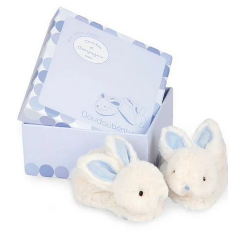 These adorable and oh-so-soft little bunny booties rattle when baby wiggles her toes. Designed by luxurious French company Doudou et Compagnie, they’re also beautifully gift boxed and would make a delightful new baby, christening or baby shower gift.