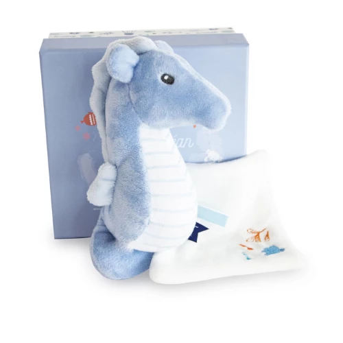 Adorable Blue Seahorse has a blue striped belly and holds a white Doudou blanket with embroidered sea shell and fish.