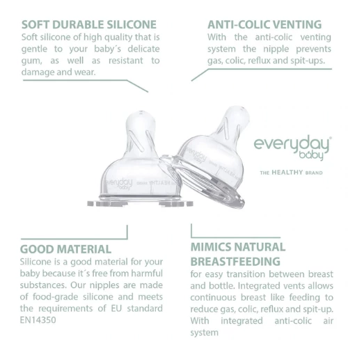 Silicone is the right choice for your baby because it´s free from harmful substances. Our anti colic nipple is made of 100% food-grade silicone.