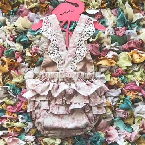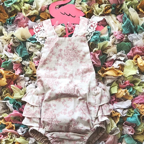 Сlassic edit of playful romper with ruffled bottom, it is the perfect mix of practical and boho. Versatile and extra gentle on the skin, our romper features press buttons at crotch for easy dressing as well as a blush lining in organic cotton. Complete with our signature French lace accents on the back-straps, this romper may be worn with tights and a sweater in winter or on its own in warmer months.