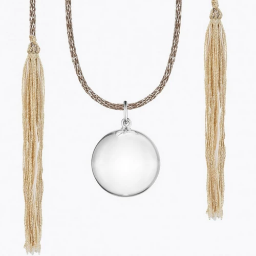 This necklace is the ideal maternity gift. Its soft chime brings calm and harmony to the mother and her baby. Its metallic cord delicately finished with sparkling tassels, is a subtle blend of the silver Bola. After birth, your baby will calm down by recognising this sweet melody heard during pregnancy. You can continue to wear your necklace during breastfeeding or bedtime, sew it inside your baby’s comforter or hang it over its cradle.