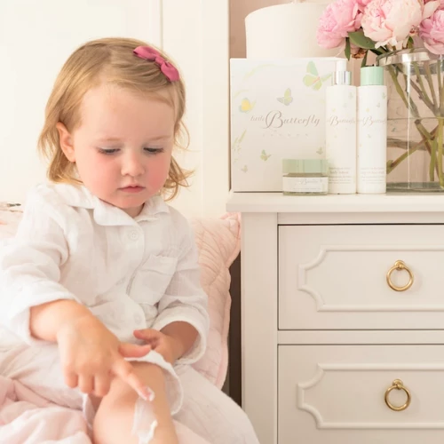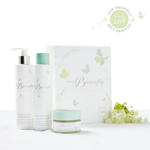 A gorgeous set to welcome a precious new baby. Little Butterfly London organic-certified collection provides three must-haves to cleanse, nourish and soothe young innocent skin.