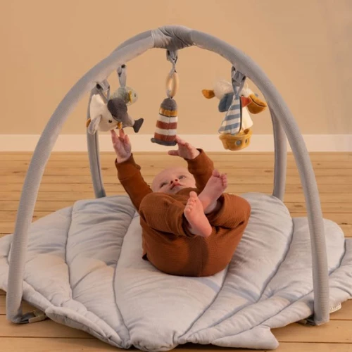 Encourage exploration. Your little one will be challenged to move, reach and grasp with this captivating activity play mat. The super-soft mat has the shape of a shell and channels a harbour-inspired aesthetic with 5 different hanging soft toys that will keep your baby engaged. There is a seagull, a pelican, a lighthouse, a sailboat and a fishy duo.