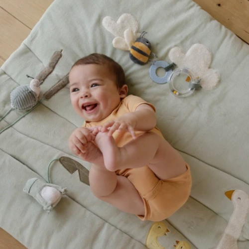 On this soft, padded playpen mat, babies will find themselves at the farmer’s pond. Little Goose and his friends are all around waiting to be discovered. They won’t have time to get bored thanks to the different materials and activities to explore, such as a mirror, rattle and crinkly and hidden toys Perfect for use in the playpen and to take with you when travelling.