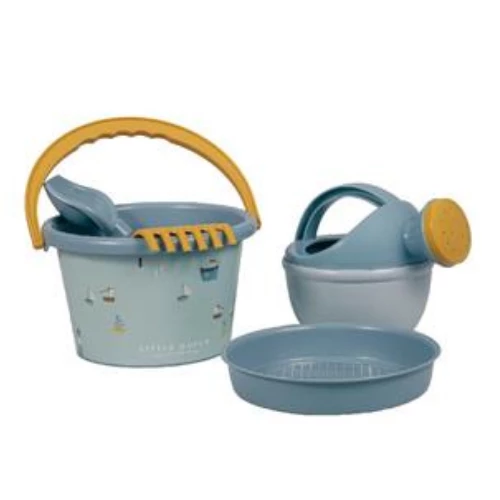 This 4-piece bucket set from Little Dutch contains all the goodies your child will need at the beach: a bucket, watering can, shovel and rake. Height of the bucket: 9,5 cm. Executed in the blue colour scheme with ochre yellow accents of the Sailors Bay theme. Comes in a net. Suitable for children 1 year and older.