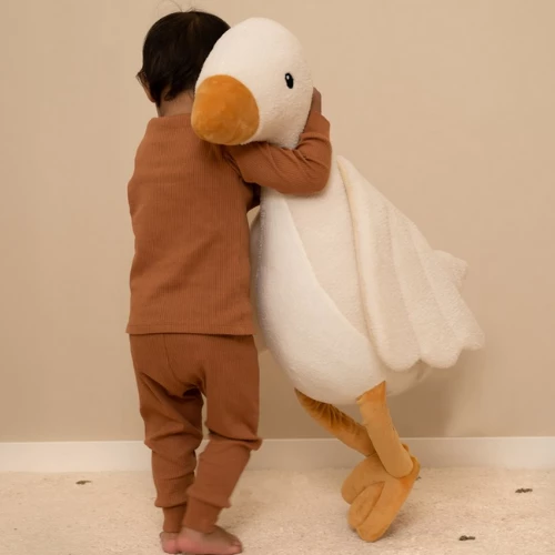 Meet Little Goose! He loves to flap his wings and go on adventure, but he is also always up for a hug. Little Goose is about 60 cm (excl. legs) and made of incredibly soft plush. The total length of the cuddly toy is about 80 cm. He can sit upright, because the bottom is filled with granules. But he would rather be with you all day; to play and of course to cuddle. The cuddles of this extra large goose are extra lovely. Nice as decoration for the nursery. Pair the cuddly toy with other items from our Little Goose collection such as a blanket or changing mat cover.