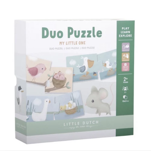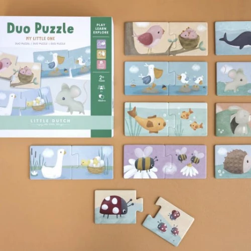 Help the baby animals and insects find their parent! Where are the baby bunnies of mama bunny? Can you match the baby whale with its dad? Have you seen Little Goose’s nest of little chicks? This cute Duo Puzzle features our beautifull illustrations of animals and their little ones on cardboard puzzle pieces. A perfect size for your little one! There are 10 matches to be made to assist your child’s development of concentration and coordination. Have fun making the puzzles together!