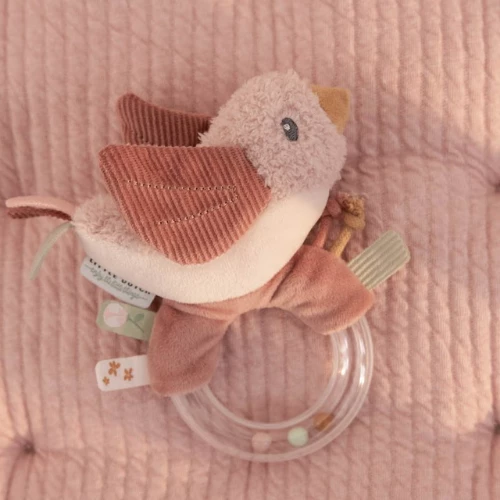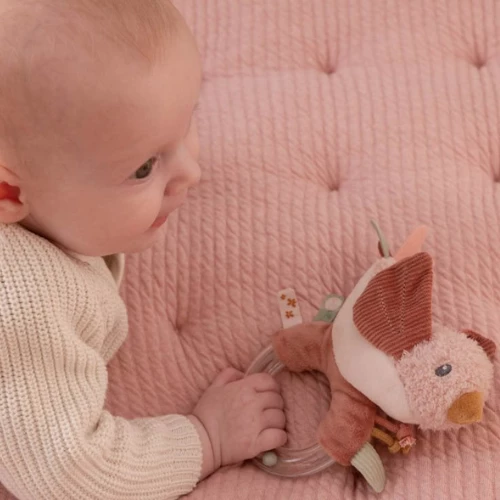 Grasp, spin and shake! This bird-shaped rattle ring is a fun toy that will trigger your baby’s curiosity. Flap her pink corduroy wings or rub her soft tummy. The transparent ring contains 3 colourful little beads that start rattling when your baby plays with this fun toy. The rattle ring enhances hand-eye coordination and stimulates the senses.