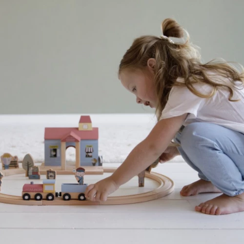 Let’s go on an adventurous train trip! Pack your bags, bring your pet and hop on the next train. This wooden train station is one of the many playsets that can be connected to the Little Dutch railway train XXL set. The wooden figurines have detailed illustrations on both sides and can be placed on the train wagon for a nice ride. Complete the train station with the railway train XXL set and additional extension sets for hours of fun play.