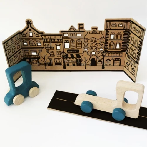 Wooden car and truck come in a cardboard packaging which can also be used for playing. Speed through the city streets with these vintage looking vehicles.
