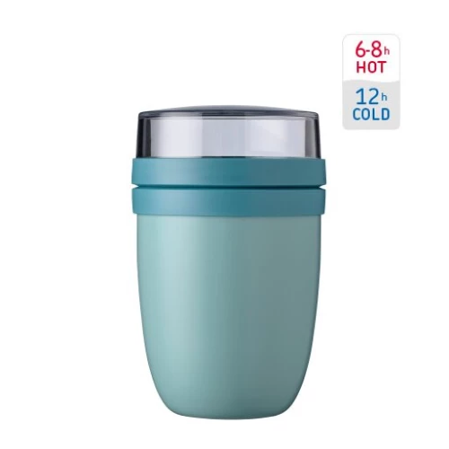 Always short of time in the mornings? Sounds familiar. Take with you the insulated lunch pot Ellipse in Nordic green with fresh yoghurt and granola (handy, because it will stay crunchy in the lid!). Your yoghurt will stay lovely and cool… right up until lunch time in this double walled stainless steel pot! In the train or at work just mix it together and… ready. On an evening shift, at school or at the gym without a microwave close by? No problem: just heat up some soup at home, pour it in the lunch pot, croutons in the lid… et voilá, even after a couple of hours you will have a tasty hot meal! This yoghurt mug keeps your food hot up until 6-8 hours* and cold up to 12. Naturally the insulated pot is 100% leak proof and will stay cool and dry on the outside, regardless the temperature of its contents. Both compartments have their own lid, which can be separated and attached together with a simple twist. The lid of the insulated lunch pot also has insulating qualities, which is why the lid of the regular yoghurt mug can’t be used for it. In order for you to enjoy using your coloured thermo lunch pot for as long as possible we advise you to hand wash it. However, the plastic parts of the cap can be cleaned in the dishwasher.