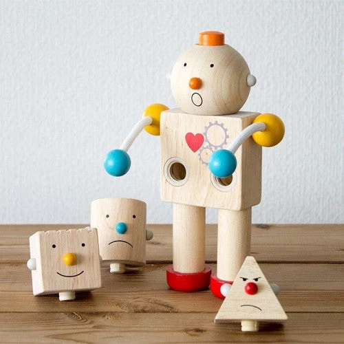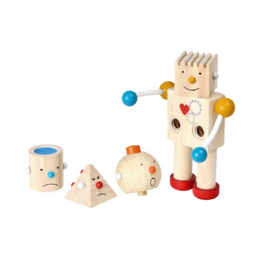 The Plan Toys Build-a-Robot is a durable wooden friend that can help your child learn emotions and facial expressions! This charming robot features four interchangeable heads, and offers different tactile & auditory experiences. Legs are movable for standing or sitting.
