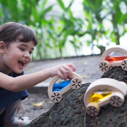 Go with the flow with Wautomobiles from Plantoys! These high-quality wooden cars each contain coloured water–red, blue, or yellow–on the inside that flows around as you play. Collect all three cars to explore how to create new colours, like by combining yellow and blue to make green! Wautomobiles are a unique toy for strengthening motor skills while teaching colours.