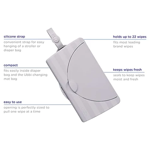 The Ubbi On-The-Go Wipes Dispenser is a part of a stylish and convenient on-the-go collection. Dispenser was designed with busy parents in mind and is intended to make diaper changes a little easier, as it holds more wipes than average and is of sturdy construction for extended use. The opening is perfectly sized, allowing for easy dispensation of one wipe at a time, keeping the rest moist and fresh. As a bonus, the dispenser includes a silicone strap for easy pairing with strollers and diaper bags.